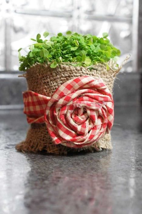 Еще один вариант как украсить цветочный горшок – мешковина. Используется по тому же принципу, что и другая ткань. Такой декор придаст саду нежный деревенский вид. Дополните его пуговицами, декоративными жучками, камешками, цветами.
