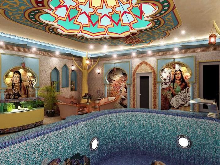 Оформление интерьера бассейна стоит начать с отделки чаши. Декоративная пленка в закрытом водоеме выглядит дешево, поэтому такой вариант нужно сразу отбросить. Природный камень тоже хорош только на открытом пространстве. Оптимальным решением станет керамика или мозаика. Выбор материалов декорирования обусловлен формой чаши, мозаика на основе сетки более удобна для оформления изогнутых линий.