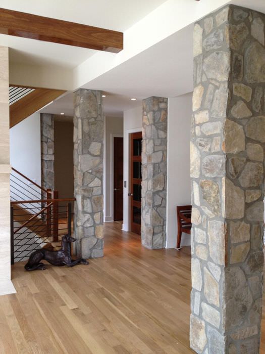 Также возможны комбинированные варианты строительства колонны в интерьере дома. Металл прекрасно сочетается с деревом и камнем.