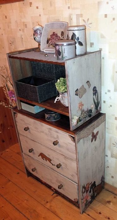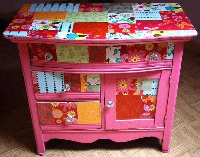 Такой метод неплохо подходит для преображения комодов и тумбочек. Он включает в себя следующие шаги: