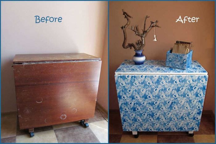Представляет собой приклеивание на поверхность мебели какой-либо картинки и покрытие лаком. Подобным образом можно украсить табуреты, столы, тумбочки, комоды, шкафы. Работа включает в себя несколько этапов, которые описаны в таблице.