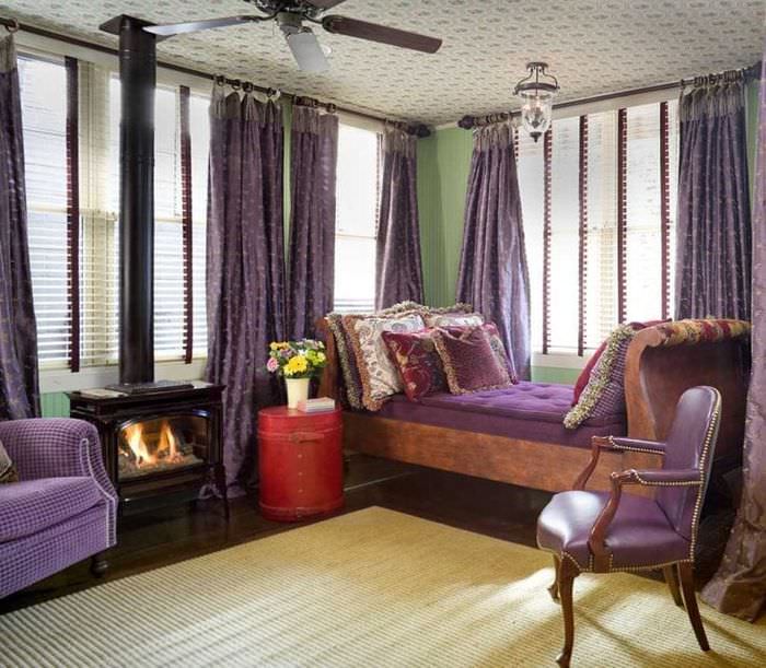 - Этнические стили – здесь яркий диван выступает центром композиции, все остальные предметы декора группируются вокруг него. Важно помнить, что пурпурный цвет обладает сильной энергетикой.