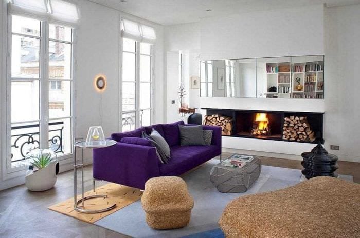 Красивый дизайн гостиной с фиолетовым диваном