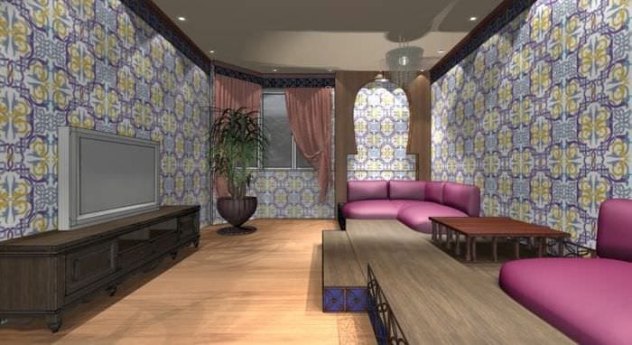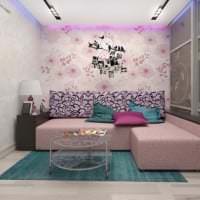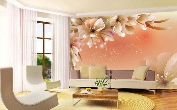Если комната больших габаритов, то крупномасштабные обои можно наклеить на все стены, начиная от пола и до потолка. Это смелое дизайнерское решение с рисунками и изображениями. В стандартных небольших пространствах такой дизайн не рекомендуется, а такие идеи сделают их еще меньше, ниже. Наиболее частый вариант – это наклеивание на одну из стен, расположенной напротив дивана или кушетки. Мебель расставляется так, чтобы не загораживать изображение.