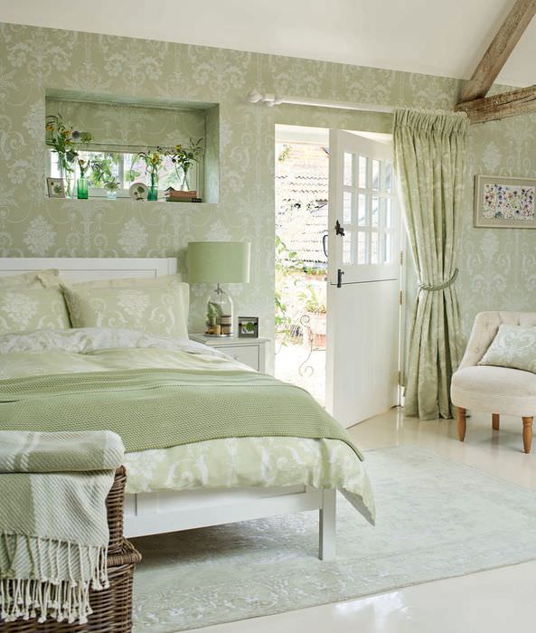 «Провансу» подойдет мятно-оливковая гамма. Сочетать ее лучше всего с мягко-розовым цветом. Это проявляется в мебели, текстиле, постельных принадлежностях, отделке стен изумрудными обоями. При обустройстве комнаты стилем «Прованс» не обязательно придерживаться правила трех цветов. Здесь используется «многоцветье». Дополнительно интерьер обставляется зелеными растениями, даже с цветами.