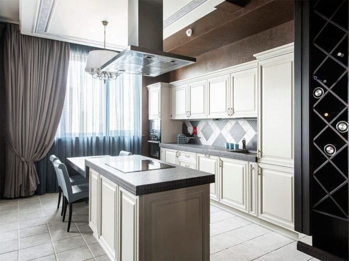 - Для интерьера кухни арт-деко характерно использование корпусной мебели с красивым фасадом, желательно лакированным, глянцевым или шлифованный шпон из древесины ценных пород. Освещение — большие люстры с хрусталиками вместо практичных плафонов. Быттехника уместна, но у нее должен быть достойный дизайн.