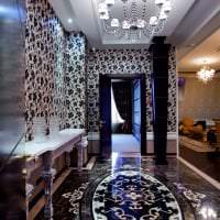 - Интерьер прихожей арт-деко не должен быть темным. Даже если это узкое помещение. Визуальный эффект расширения стен делают за счет зеркальной стенки, светлого пола под фактуру природных материалов и продуманного освещения.