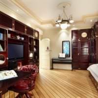 Корпусная мебель под натуральное дерево» может быть и нейтральной. Ее несложно украсить пластиковыми наклейками с рыбками или аппликацией. На полки и все плоские поверхности раскладывают сувениры и поделки. Если хочется больше свободно пространства, то лучше убрать корпусную мебель вообще, а все вещи прятать в ниши и встроенные шкафы. А морские атрибуты и сувениры расставить на стеклянных угловых полках, закрепленных кронштейнами. И лучше, если они будут выше уровня головы.