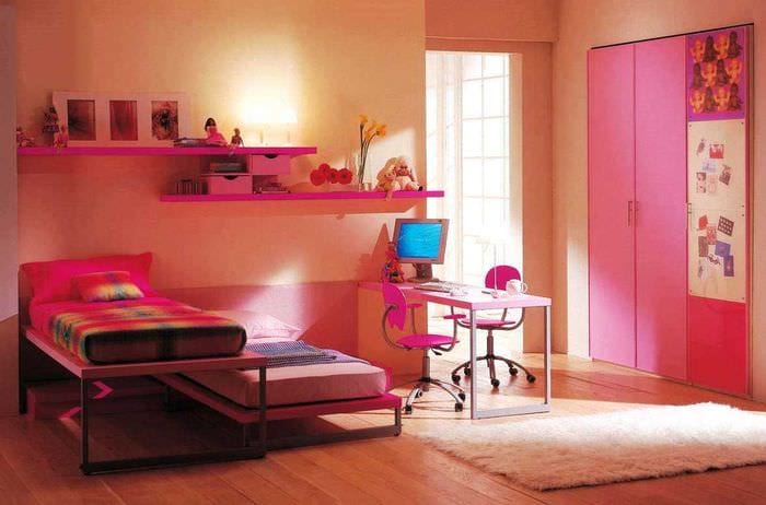 - Розовый цвет нравится многим девочкам, но у него много оттенков – нежный оттенок лепестков чайной розы уместен в дизайне маленькой детской для двух девочек, цвет «фуксия» уместна лишь в деталях декора.