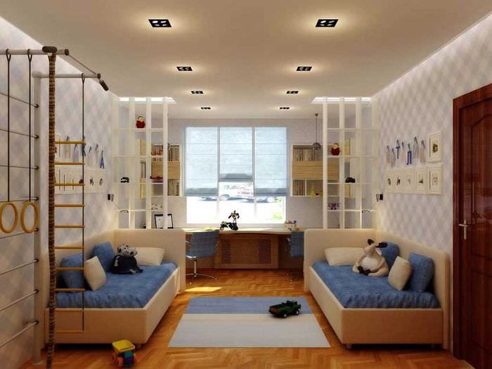 Место для игр. При оформлении данной зоны важно учитывать предпочтения обоих детей. Лучше всего предоставить право выбора данного решения детям: они сами подскажут вам, что станет для них идеальной игровой зоной: спортивная горка со снарядами, баскетбольное кольцо или гимнастический мат.