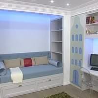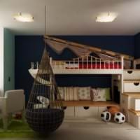 - Морская тематика. Это не бюджетный вариант ремонта, включающий в себя подвесную кровать в виде корабля. Рекомендуемая цветовая гамма помещения: голубые, синие оттенки и белый цвет. Элементы декора: корабельный якорь, спасательный круг, компас, карты, морские обитатели. Дверцы бельевых шкафов следует превратить в иллюминаторы, а на одной из стен повесить лестницу из верёвки. Одним из подвидов морской тематики станет пиратский стиль. В нём обязана быть подзорная труба, морские карты, треуголка, пиратский флаг.