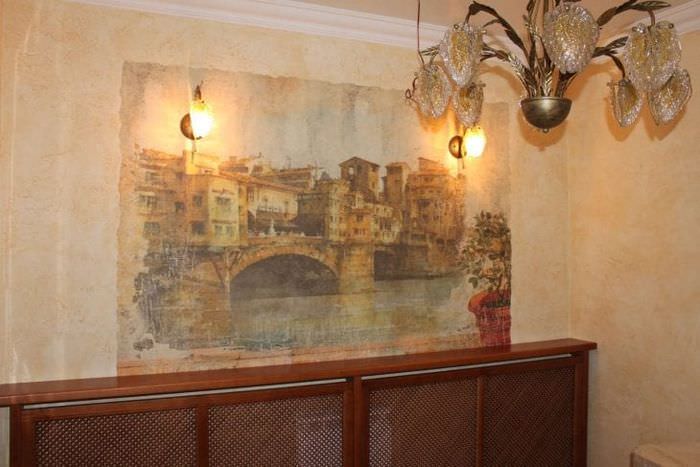 - На холсте – весьма недешевый способ декорирования интерьера. Художник разрисовывает холст, покрытый грунтовкой, натуральными пигментами. Готовый вариант для дома приобрести нельзя, придется вызывать мастера на дом. Поверхность искусственно состаривают и покрывают защитным восковым покрытием.