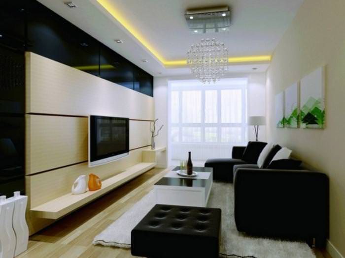 Мебель устанавливается возле длинных стен. При этом она максимально узкая. Уместно использовать ковер с полосами, параллельными коротким стенам. Это позволяет зрительно увеличить пространство.