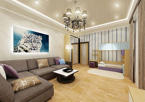 Еще один способ – точечное освещение. Оно позволит разделить комнату на зоны, создать необходимые эффекты. Уровень видимости во всех частях будет высоким. Такой вариант освещения отлично подходит для оформления небольших гостиных. Так как лампочки встраиваются в подвесную конструкцию потолка и не выступают.