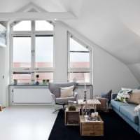 Очень красиво смотрится лофт в классическом проекте, как на фото. Светлые, белые оттенки, черное обрамление оконных рам и деревянные потолки – интересное, необычное решение. В интерьере, возможно, сочетать мебель и другие предметы из разных материалов. В последнее время актуальными считаются натуральные материалы и напольное покрытие из керамической плитки. Некоторые все же предпочитают ламинат.