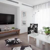 Расположение является неудобным, сокращая варианты расстановки мебели. Телевизор стоит поставить рядом со стеной где есть дверь. Напротив ставят диван, столик и элементы декора. |