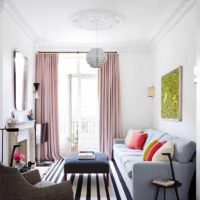 Плюсом проходной в хрущевке является окно, занимающее большую часть стены. Дополните оконный проем легкими почти прозрачными шторами, что позволит мягко рассеивать свет. Напротив стоит разместить перегородку с зеркальной или глянцевой поверхностью. Для расширения пространства можно соединить гостиную и кухню. Не используйте объемную мебель, она визуально «съест» площадь. Обращайте внимание на компактные, многофункциональные варианты. Большие люстры не подойдут для комнаты. Замените их торшерами и бра.