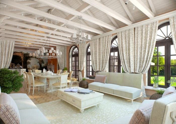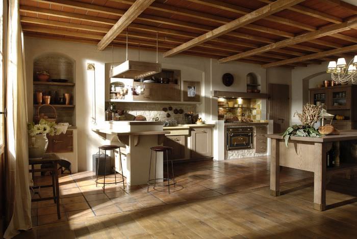 Начинать подбор цветовой палитры лучше с отделочных материалов. Стены, потолок стоит оформить светлой облицовкой. Светлые бежевые, молочные тона сделают помещение просторным, воздушным. На светлом фоне идеально будут смотреться любые детали дизайна. Разбавить светлый потолок можно коричневыми деревянными балками. В цвете балок стоит оформить пол. Разрешено использовать разные тона коричневого цвета.
