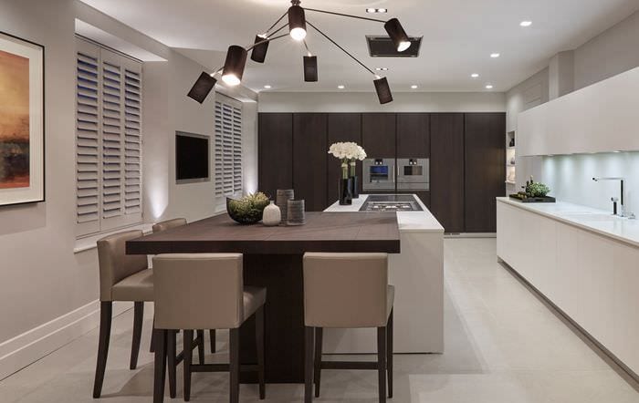 Выбирая темные тона для дизайна кухни, рекомендуется внимательно отнестись к выбору освещения. Оно обязательно должно быть многоуровневым, разбитым на зоны. То есть кроме центральной люстры должна быть продумана подсветка рабочей и обеденной зон, можно пустить светодиодную ленту по периметру гарнитура. Так дизайн помещения будет выглядеть законченным и целостным.