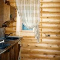 Пластиковые и хромированные фасады шкафов редко удается органично вписать в интерьер кухни в рубленом доме, лучше брать мебель с облицовкой массивом или шпоном.