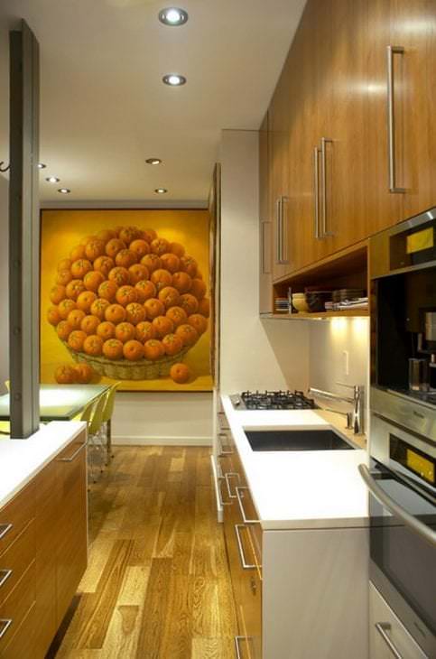 Моющиеся обои для маленькой кухни станут настоящей находкой, если изображение будет выбрано правильно. Сочетая яркие картинки со спокойными по тону стенами и мебелью, вы добьетесь расширения пространства. Фотообои на кухне пастельных тонов следует разбавить яркой мебелью и аксессуарами.