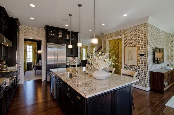Каталог может включать в себя темные обои с множеством мелких рисунков. Такой вариант выглядит весьма эффектно, но для маленького помещения не подойдет. При этом, выполнив такой дизайн, будет казаться, что на кухне все время царит беспорядок. Для небольшого помещения лучше выбрать однотонные материалы с большими предметами – ягодами, цветами и прочим. Можно посмотреть каталог и найти изображения лестниц или аллей – они тоже помогут увеличить пространство.