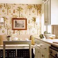 Наклеивание на одну из стен фотообоев сделает кухню красивой