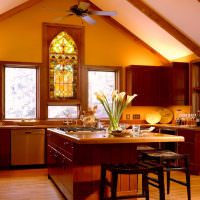 Красивый желто-зеленый цвет кухни очень успокаивающий, солидный и спокойный. Если кухня на юге, можно экспериментировать со всеми оттенками желтых огненных цветов.