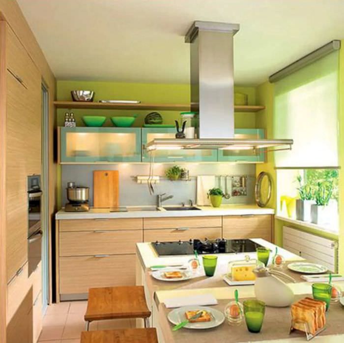 Зеленый цвет кухни по фен шуй подойдет в сочетании с желтым.