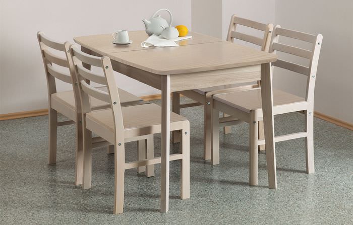 В категорию самой практичной кухонной мебели можно отнести обеденные столы из опилочной «халвы» или фанеры, декорированной ламинированным покрытием.