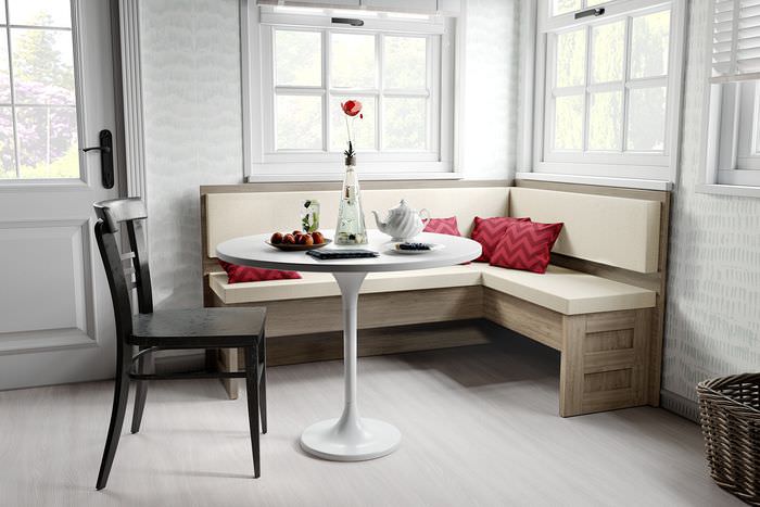 Единственный минус – на столешницу специфической конфигурации не всегда удается подобрать подходящую скатерть для праздничного застолья. Поэтому часто используют традиционный кухонный текстиль прямоугольной формы.