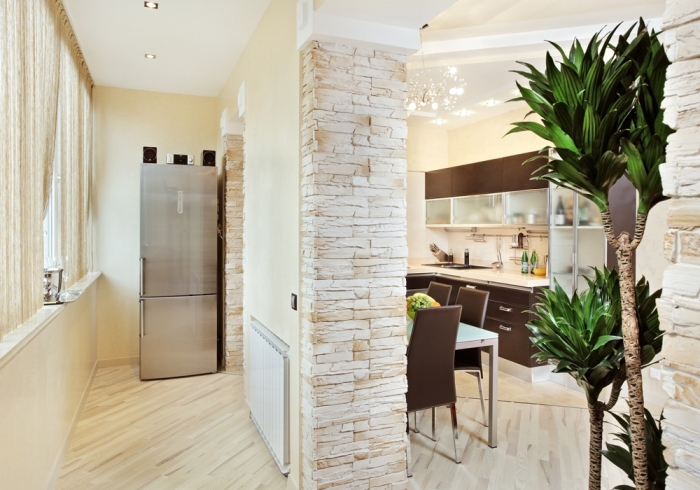 Если кухня имеет выход на лоджию или балкон, то хорошим способом разгрузить пространство будет установка мебели на том самом балконе. Однако, такой вариант не пользуется особой популярностью, ведь чтобы его осуществить, нужно заранее утеплить лоджию так, чтобы даже во время суровых холодов там сохранялась комнатная температура. Также нужно обеспечить качественную вентиляцию балкона, которая важна для предотвращения перегрева или, напротив, появления конденсата в большом объеме. Кроме того, на холодильник не должны попадать прямые солнечные лучи, а основание балкона должно быть укрепленным с учетом веса холодильника.