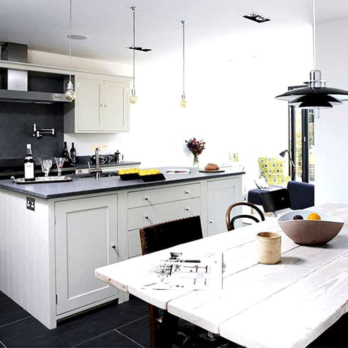 Любое помещение, в том числе и кухни, разделяется на рабочие области. Это можно увидеть на многочисленных фото в сети. При разработке интерьера гостиной, часто комнату используют в качестве кабинета или столовой, соответственно её разделяют на две или три рабочих области. При планировке спальни, совмещают зоны сна и пассивных развлечений. Кухни часто разделяют на зону приготовления и столовую, а зал делят на несколько частей. Всё зависит от размеров комнаты и квартиры, но дизайнеры часто выходят из положения, применяя визуальные эффекты расширения.