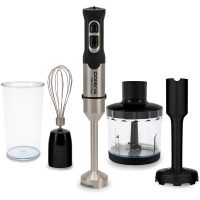 Ручной блендер имеет много различных насадок: нож универсальный, венчик для взбивания, насадки для дробления льда, различные терки, насадка для пюре и замешивания теста. Некоторые модели содержат в наборе 1-2 чаши, хотя при работе с погружным блендером можно пользоваться любыми глубокими емкостями.
