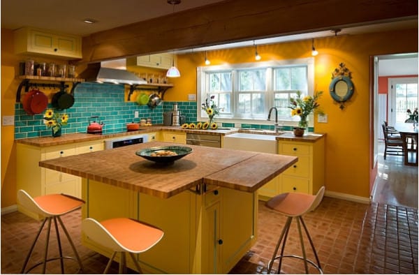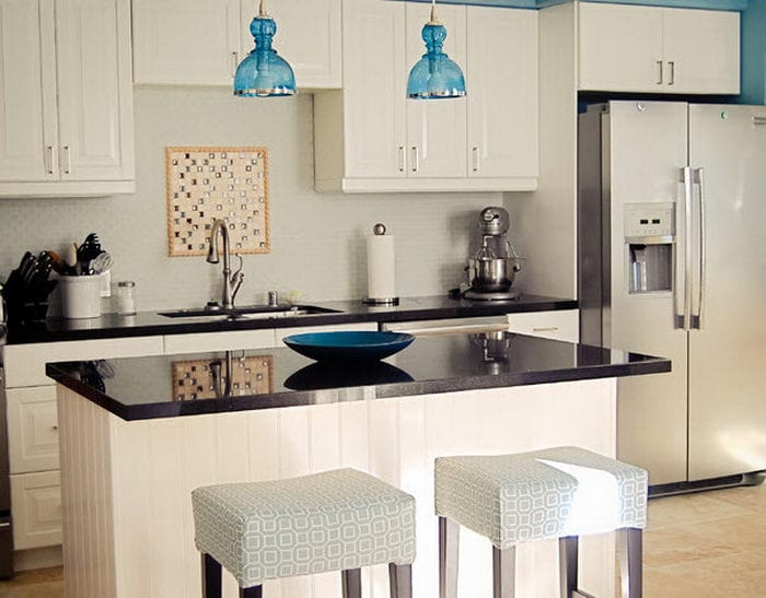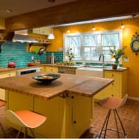Чтобы данный тип мебели не выбивался из общей композиции, можно воспользоваться одним очень действенным приемом. Использование ярких акцентов на всех поверхностях гарнитура будет смотреться очень стильно и уместно. Например, если ваша кухня оформлена в синем цвете, туда отлично впишется сооружение с синей рабочей поверхностью или с корпусом аналогичного оттенка. Визуально расширить пространство можно с помощью контрастной игры цвета. Как правило, помещение делится на кухонную и гостевую зоны.