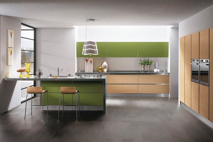 - Светло-зеленые оттенки в сочетании с морковным и оливковым – превосходный выбор для кухни. Это «экологичное» сочетание повышает аппетит, улучшает настроение.