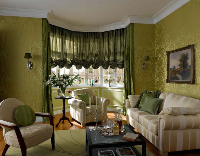 Сочетание оливкового и коричневого цветов в дизайне гостиной