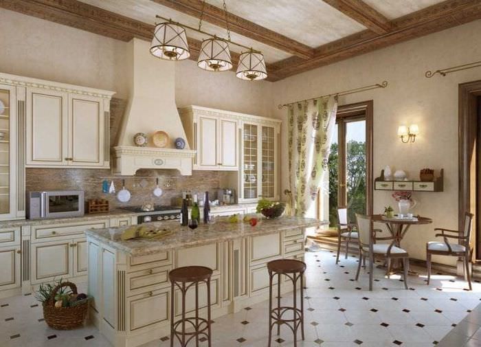 Так как пространство должно быть наполнено дневным светом, то не стоит выбирать темные и непроницаемые шторы, лучше ограничиться простой фактурой, одним тоном и натуральными компонентами в составе. В вечернее время включают небольшие светильники, люстры, бра, торшеры, где на кованых или бронзовых основаниях могут находиться привлекательные абажуры.