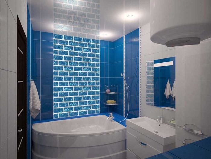 Дизайн ванной комнаты выполнен в морском стиле с подсветкой стены