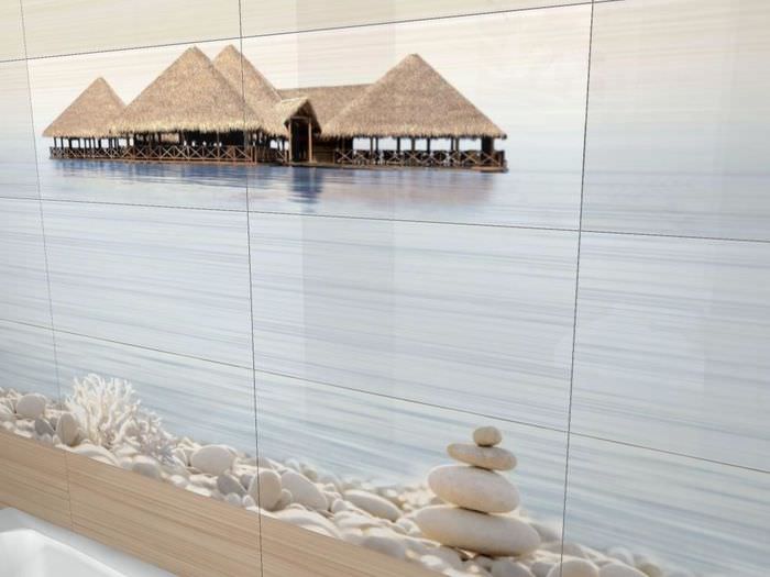 Есть еще кафель с фотопечатью или принтом. Особенно эффектно выглядят панно с 3D эффектом, как на фото, визуально расширяющее пространство.