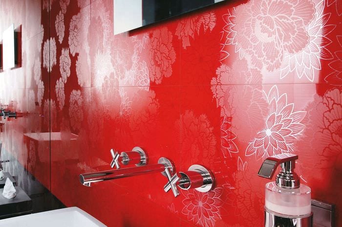 - Красный. Современный и стильный цвет для оформления ванной комнаты. Идеально сочетается с белым. Используется в восточном стиле и арт-деко. Можно оформить крупной красной плиткой только одну стену, акцентировав на ней внимание.