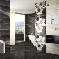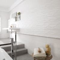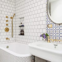| Классика | Универсальный вариант как для комнаты с маленькой площадью, так и для больших квартир. Отделку стен следует выполнять в двух тонах. Если использовать плитку с геометрическим рисунком или фотопринтом, ванная будет более оригинальной. |