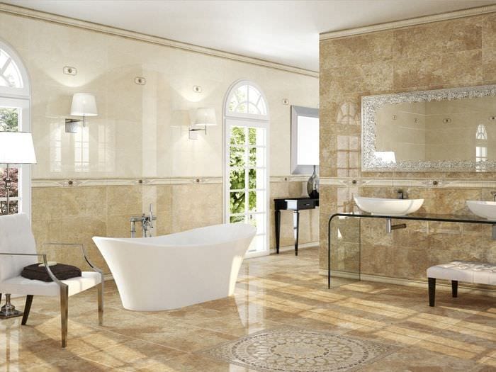 Для создания эффектного дизайна плитки в ванной стоит использовать керамогранит. Выглядит он красиво, есть варианты для оформления ванной комнаты в стиле барокко. Напольная плитка используются в большинстве домов, потому что она не боится падения каких-либо вещей. Продаются виды, идеально подходящие для оформления стен.