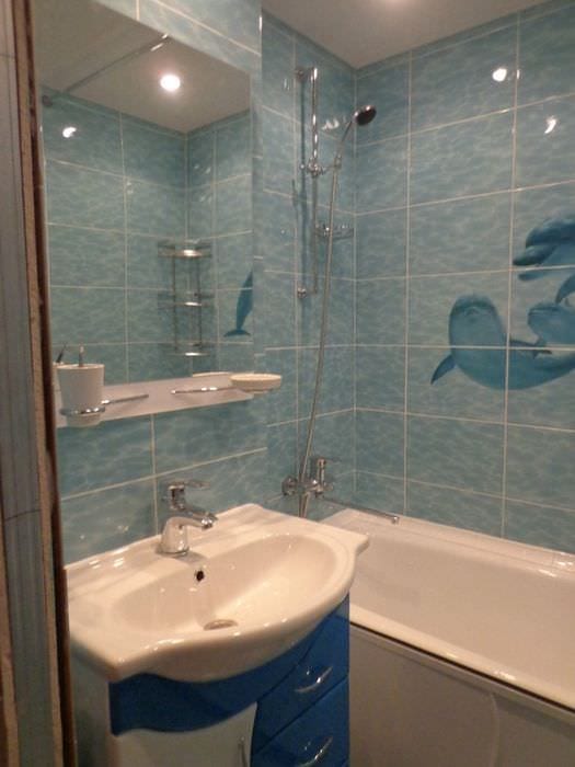 Ремонт хрущевских квартир вовсе не означает отказ от стилевого решения. Есть немало примеров, когда в небольшой ванной комнате выбрали для отделки.