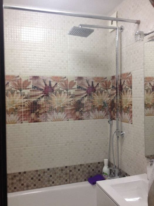 Отделка стен ванной комнаты выполнена из керамической плитки разных цветов