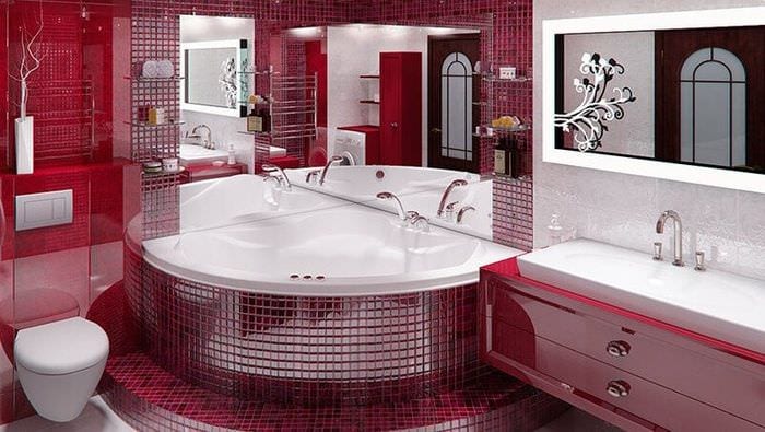 В качестве отделочного материала стоит использовать плитку. Хорошо смотрится кафель с глянцевой поверхностью. Он отражает свет, что визуально расширяет границы комнаты. Не стоит забывать о наличии зеркал. Их может быть несколько, что также будет создавать положительный эффект.