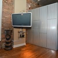 В первом случае практичного выхода из ситуации возможно использовать расположение кровати. Доработав спинку с помощью решетки или дополнительной стенки, над кроватью появляется место – подставка для телевизора. При этом кровать автоматически станет местом для отдыха у хозяев, а стенка разделит зону.
