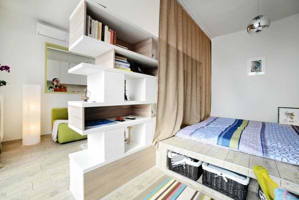 Еще один пример, разделения происходит с помощью разграничения спальной и гостиной зоны стеллажом. Конструкция стеллажа разнообразная, его создают с выдвижным ящиком для кровати или оборудуют в виде полок для книг и вещей. Стеллаж делают монолитным и непрозрачным или с полками насквозь, пользоваться которыми возможно с любой стороны.