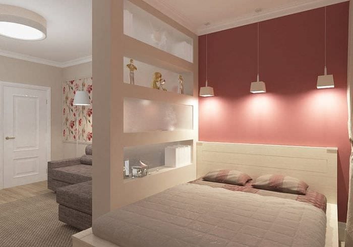 Еще один способ подходит если кровать расположена у окна. Сделайте перегородку размера, достаточного для отделения изголовья, в таком случае не теряется естественное освещение.
