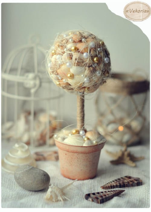 - Топиарии из ракушек – круглое деревце с основой из пенопласта, которое обклеивается ракушками, жемчужинками и другими декоративными элементами.